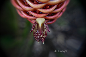 When it flowers, these tiny orchid-like bloom protrudes from the cones. It is hard to imagine that a tough, robust and rubbery bulb could produce such a delicate flower.