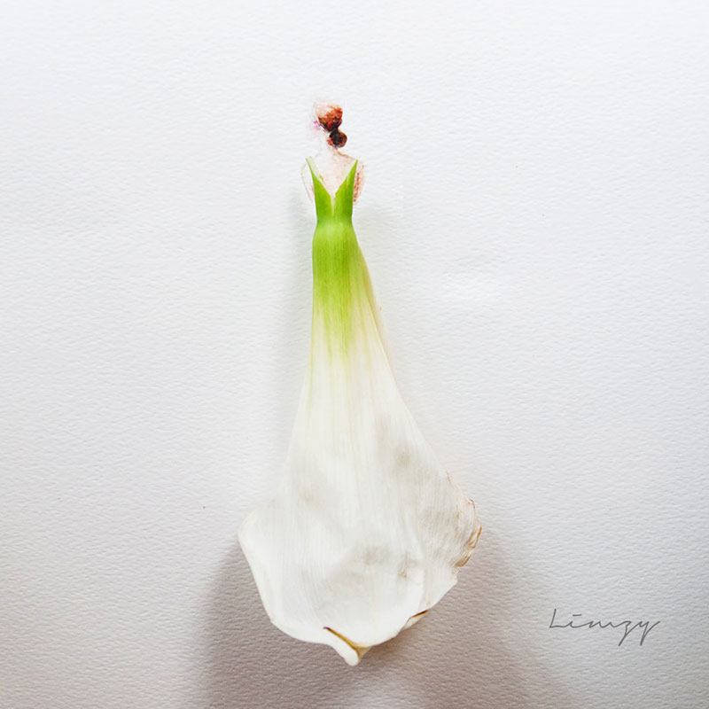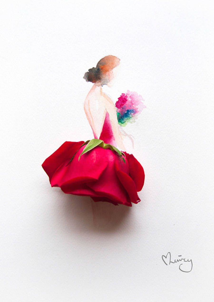 The artistMalaysianLim Zhi Wei aka Love Limzy creates stunning illustrationsof dresses and women that post on his Instagram account daily. His series Flower Girls includes sketches of dresses with petticoats and ruffles are made with real flower petals: orchids, roses, daisies, and various plants.